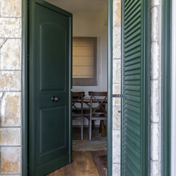 The garden features an open-air patio with a monastic-style table and benches, perfect for family meals and relaxing in nature. The house offers private parking for one car, while there is also a large stone-paved shared parking area for all residences in the complex.